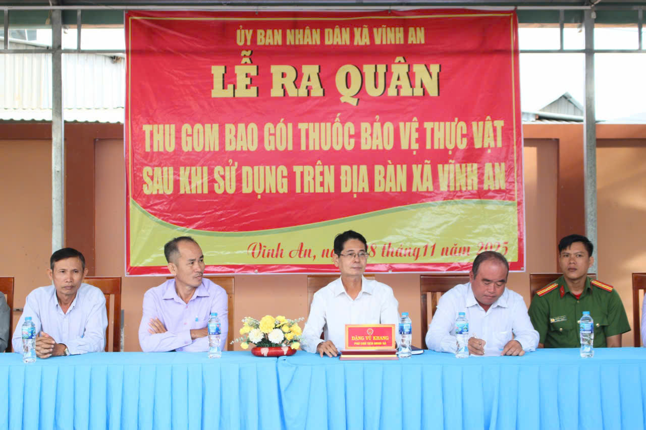Nhằm góp phần bảo vệ môi trường nông thôn và kêu gọi ý thức của người dân, nhất là người sử dụng thuốc Bảo vệ thực vật. Ngày 28/11/2025, Ủy ban nhân dân xã Vĩnh An tổ chức buổi lễ “Ra quân thu gom võ chai, bao bì thuốc bảo vệ thực vật sau khi sử dụng bảo vệ môi trường”. Đồng chí Đặng Vũ Khang, Ủy viên ban thường vụ Đảng ủy, Phó Chủ tịch UBND xã Vĩnh An cùng các đồng chí là lãnh đạo các phòng, các ngành, các ấp tham dự.