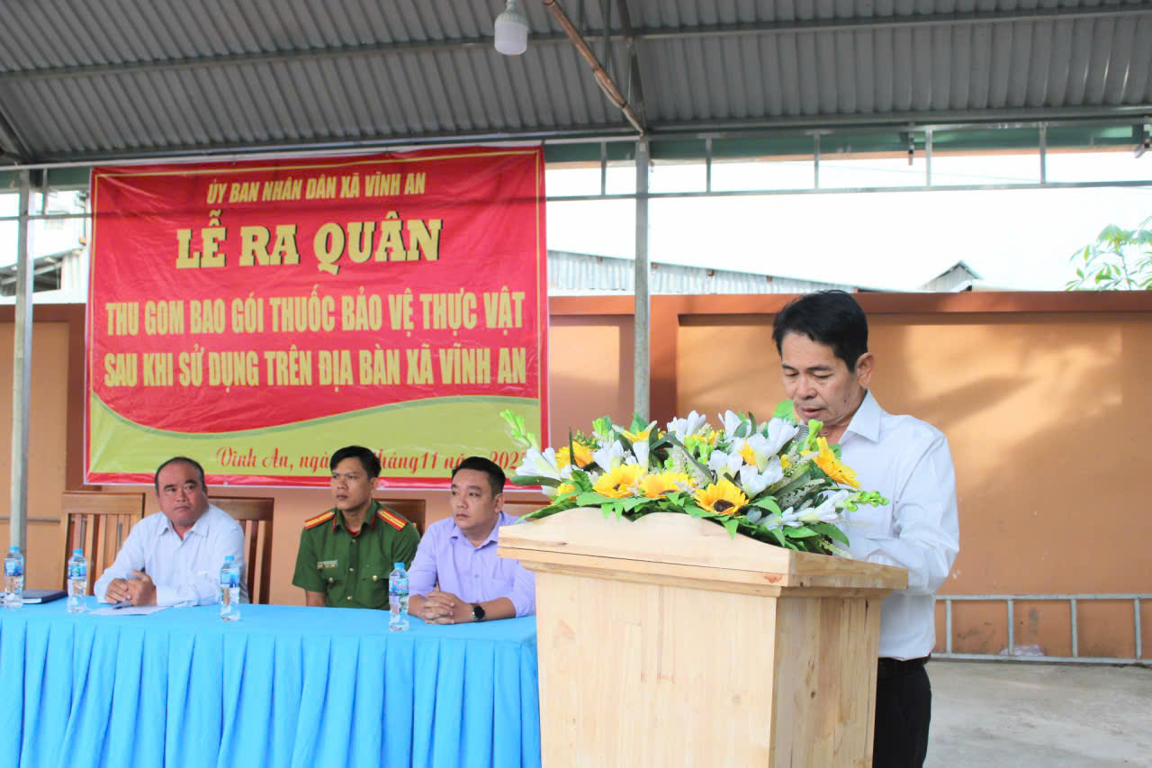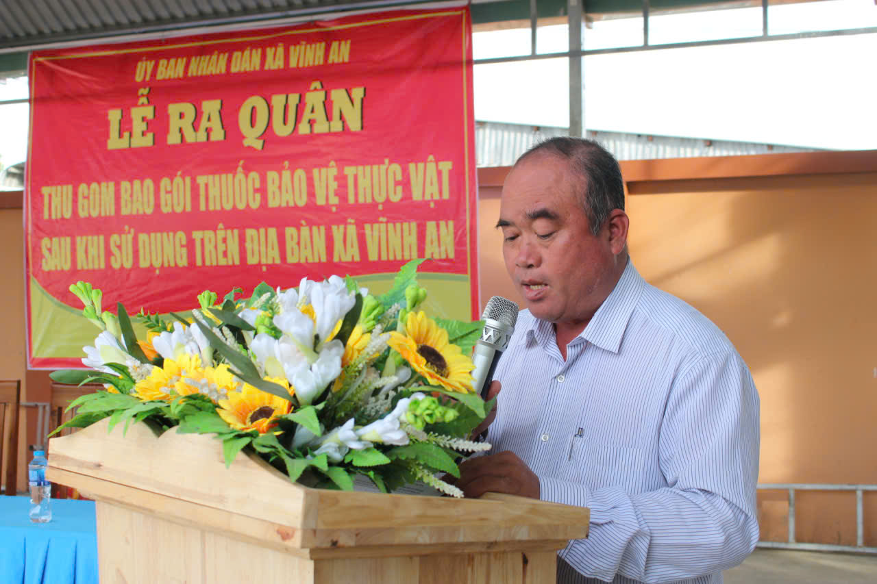 Đồng chí Đặng Vũ Khang, Phó Chủ tịch UBND xã Vĩnh An phát động ra quân thu gom võ chai, bao bì thuốc bảo vệ thực vật bảo vệ môi trường