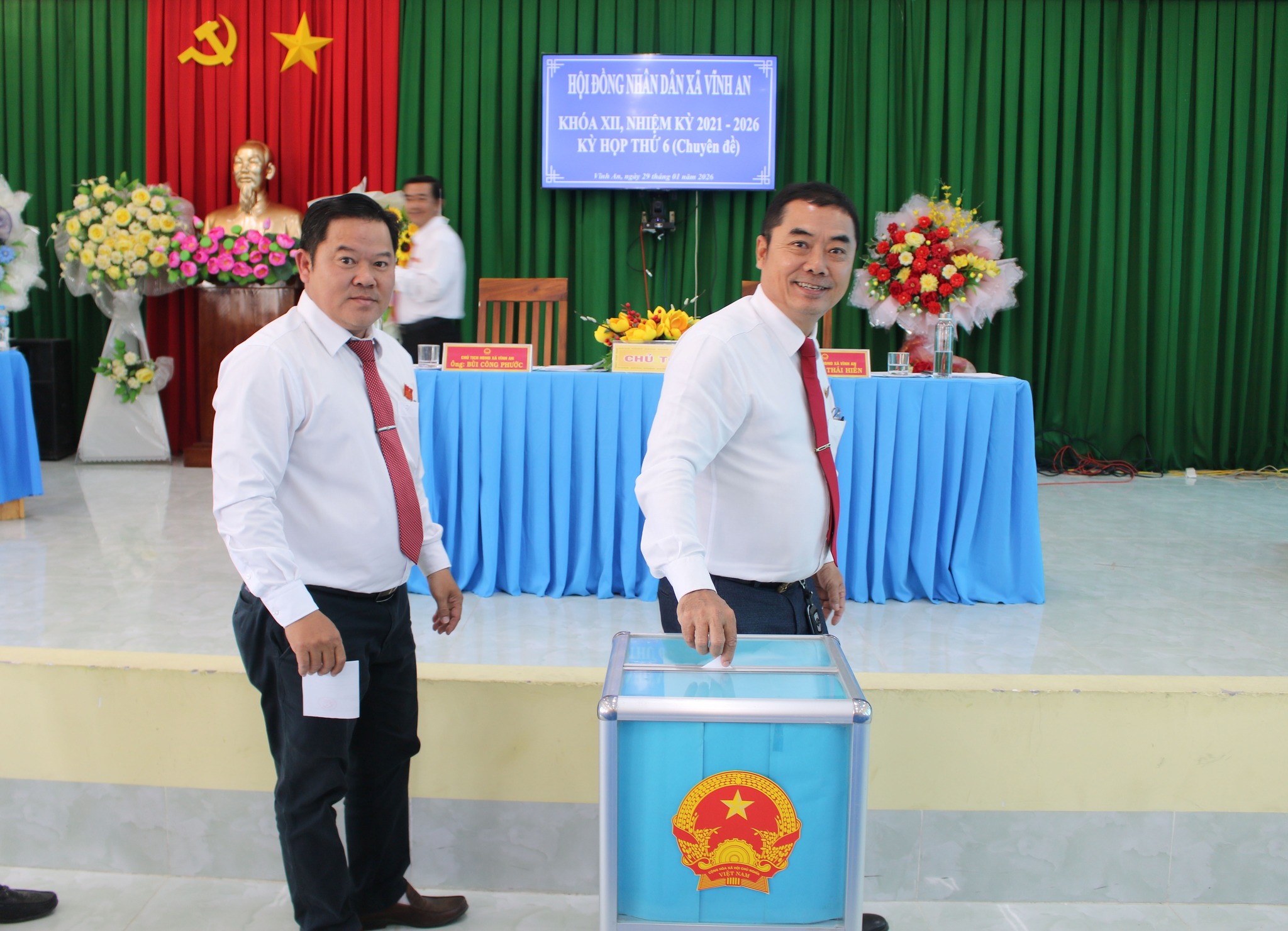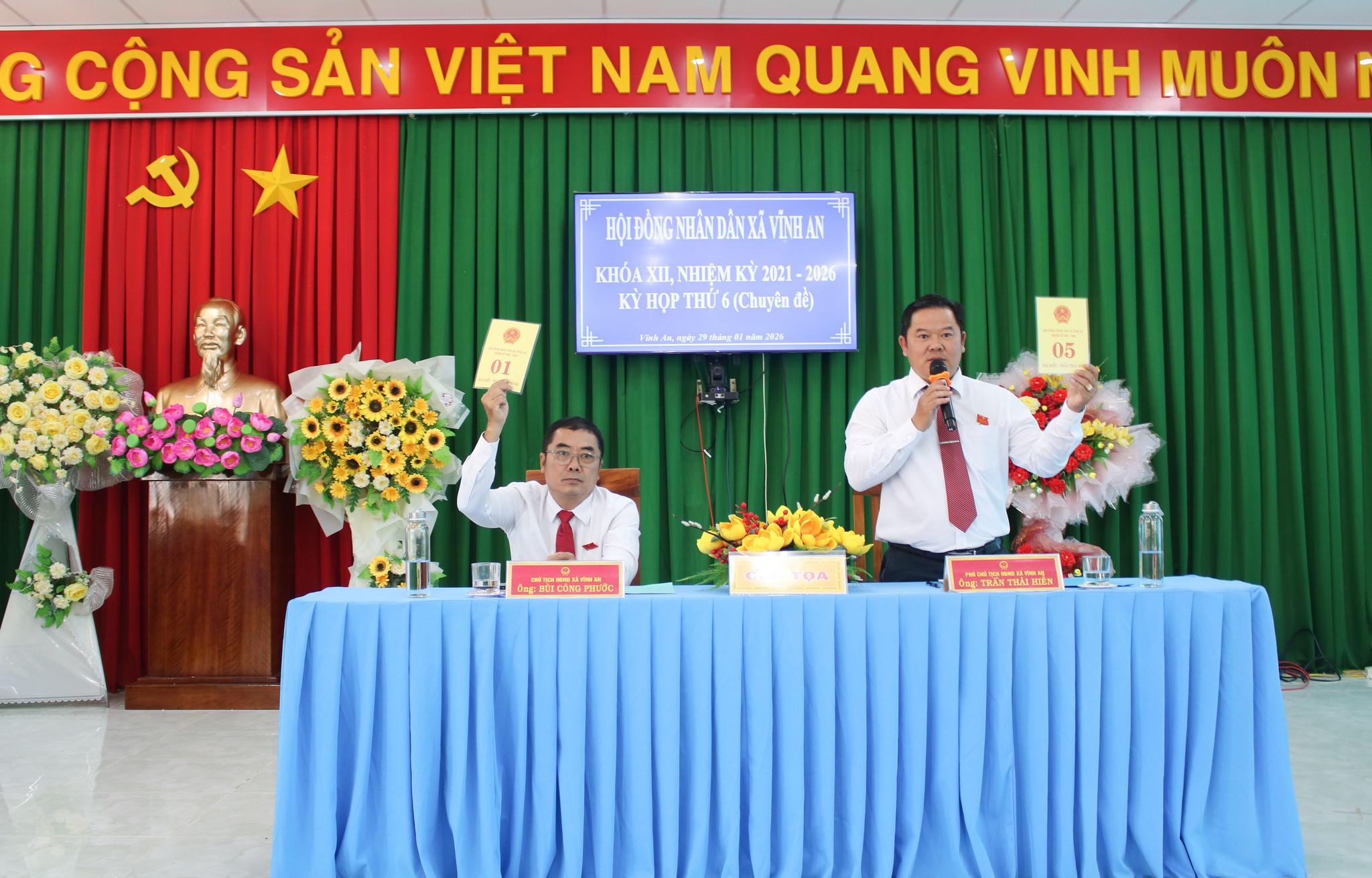Trên tinh thần khẩn trương, nghiêm túc, đại biểu HĐND xã đã biểu quyết thông qua dự thảo các Nghị Quyết gồm: Nghị quyết điều chỉnh chương trình giám sát của Hội đồng nhân dân xã năm 2026; Nghị quyết về kế hoạch phát triển kinh tế - xã hội 5 năm 2026 – 2030; Nghị quyết tạm giao biên chế cụ thể cán bộ, công chức trong cơ quan chính quyền địa phương xã, số lượng người làm việc hưởng lương từ ngân sách nhà nước trong các đơn vị sự nghiệp công lập thuộc phạm vi quản lý trên địa bàn xã Vĩnh An năm 2026; Nghị quyết tạm giao số lượng người hoạt động không chuyên trách hưởng phụ cấp từ ngân sách nhà nước trên địa bàn xã Vĩnh An năm 2026 theo quy định của chính quyền địa phương cấp tỉnh; Nghị quyết phê chuẩn kết quả bầu bổ sung nhân sự giữ chức vụ Ủy viên Ủy ban nhân dân xã (phụ trách quân sự) nhiệm kỳ 2021- 2026.
