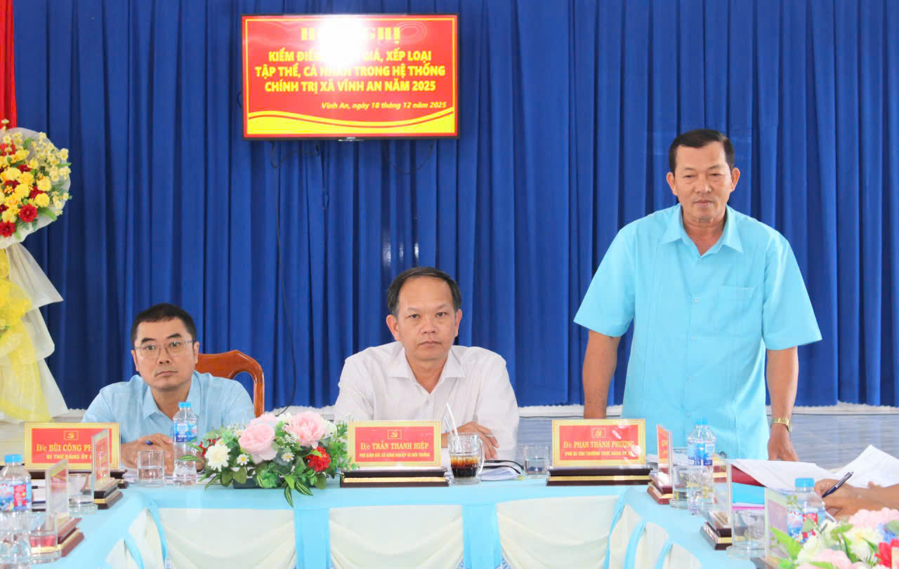 Ngày 18/12/2025, Đảng ủy xã Vĩnh An tổ chức hội nghị kiểm điểm và đánh giá, xếp loại tập thể, cá nhân Ban thường vụ Đảng ủy xã năm 2025. Tham dự hội nghị có đồng chí Trần Thanh Hiệp, Phó Giám đốc Nông nghiệp và Môi trường tỉnh An Giang; đồng chí Bùi Công Phước, Bí thư Đảng ủy, Chủ tịch HĐND xã chủ trì hội nghị.