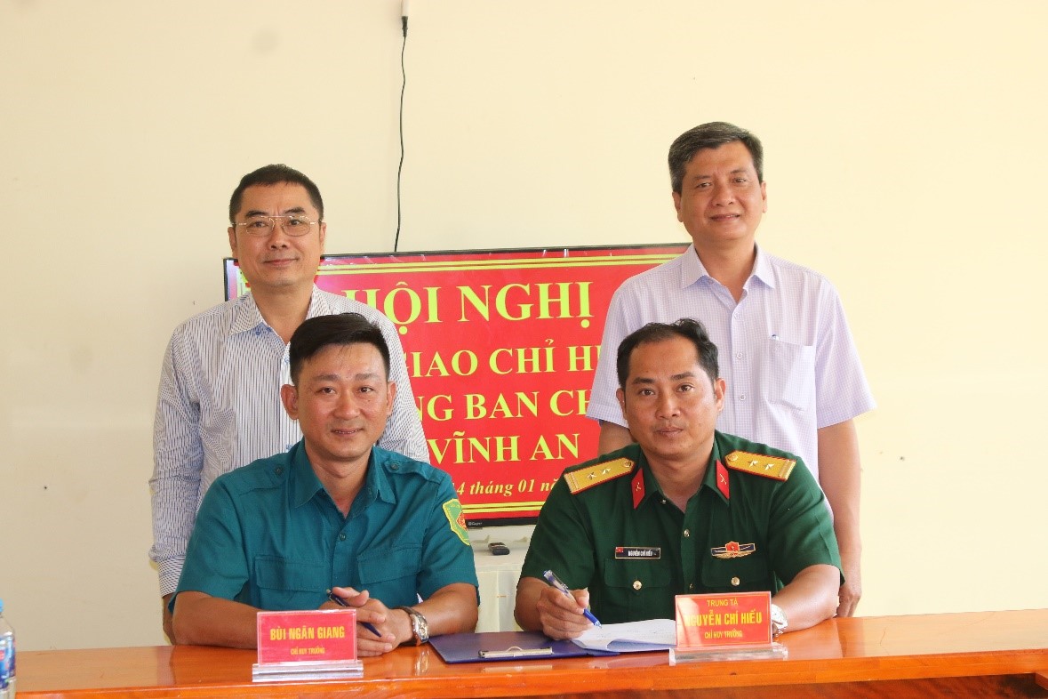 Tại buổi lễ, đồng chí Bùi Ngân Giang, nguyên Chỉ huy trưởng Ban Chỉ huy quân sự xã Vĩnh An thông qua biên bản bàn giao nhiệm vụ chỉ huy trưởng Ban Chỉ huy quân sự xã đối với đồng chí Trung tá Nguyễn Chí Hiếu.