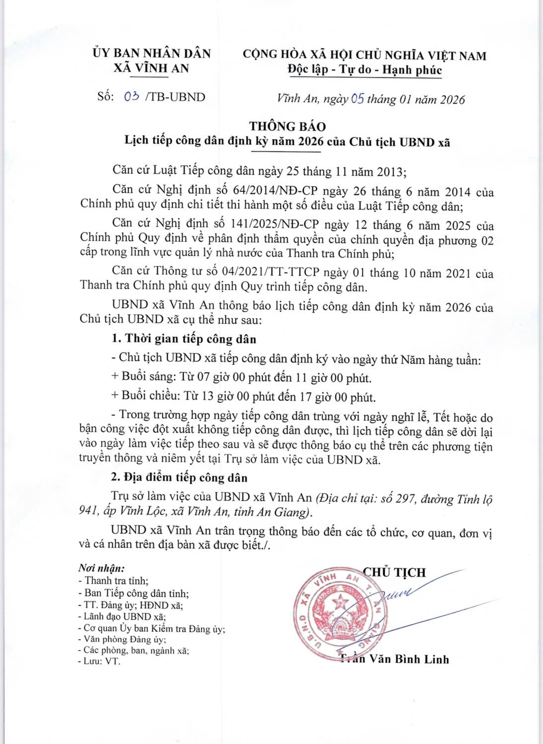 Lịch tiếp công dân định kỳ năm 2026 của Chủ tịch UBND xã