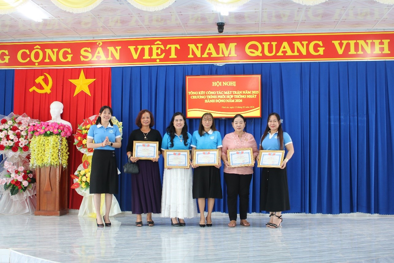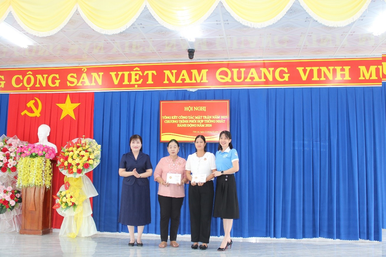 Sáng ngày 13/2/2026, Ủy ban Mặt trận Tổ Quốc Việt Nam xã Vĩnh An tổ chức hội nghị tổng kết công tác Mặt trận Tổ quốc năm 2025 và chương trình phối hợp thống nhất hành động năm 2026. Dự hội nghị có đồng chí Thái Thị Duy Ngân, Phó Chủ tịch Hội Liên hiệp Phụ nữ tỉnh; đồng chí Phan Thành Phương, Phó Bí thư thường trực Đảng ủy xã Vĩnh An; đồng chí Tạ Thị Ngọc Thạch, Ủy viên Ban thường vụ Đảng ủy, Chủ nhiệm Ủy ban kiểm tra Đảng ủy xã; đồng chí Khưu Hoàng Thông, Ủy viên Ban thường vụ Đảng ủy, Chủ tịch Ủy ban Mặt trận Tổ Quốc Việt Nam xã Vĩnh An.