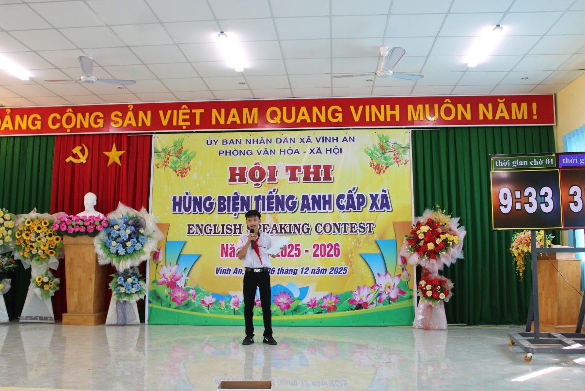 Sáng ngày 6-12-2025, Phòng Văn hóa - Xã hội xã Vĩnh An tổ chức hội thi Hùng biện tiếng Anh năm học 2025 – 2026. Dự hội thi có đồng chí Hồ Minh Thông, Trưởng Phòng Văn hóa - Xã hội xã Vĩnh An cùng cán bộ, ban giám hiệu, giáo viên các trường tiểu học, THCS trên địa bàn xã tham dự.