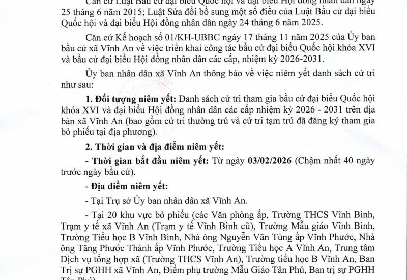 Năm 2026 là năm khởi đầu thực hiện kế hoạch 5 năm phát triển kinh tế xã hội 5 năm giai đoạn 2026 – 2030, UBND xã Vĩnh An đề ra các nhiệm vụ trong tâm để thực hiện hoàn thành các chỉ tiêu phát triển kinh tế xã hội xã góp phần vào tăng trưởng chung của tỉnh và tạo đã cho tăng trưởng giai đoạn tới.
